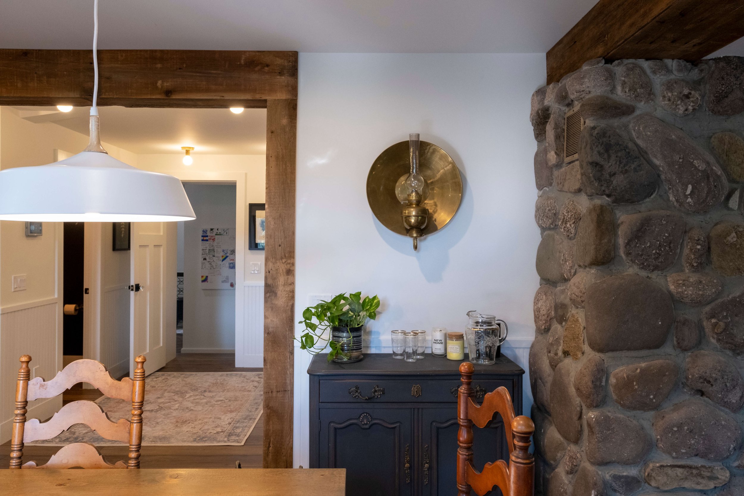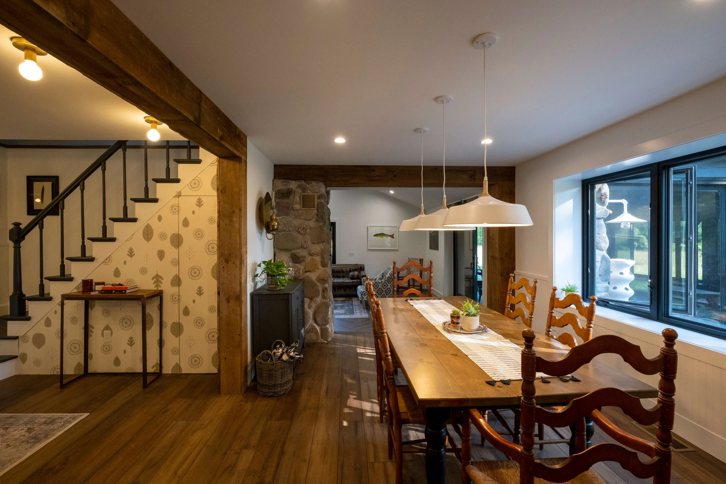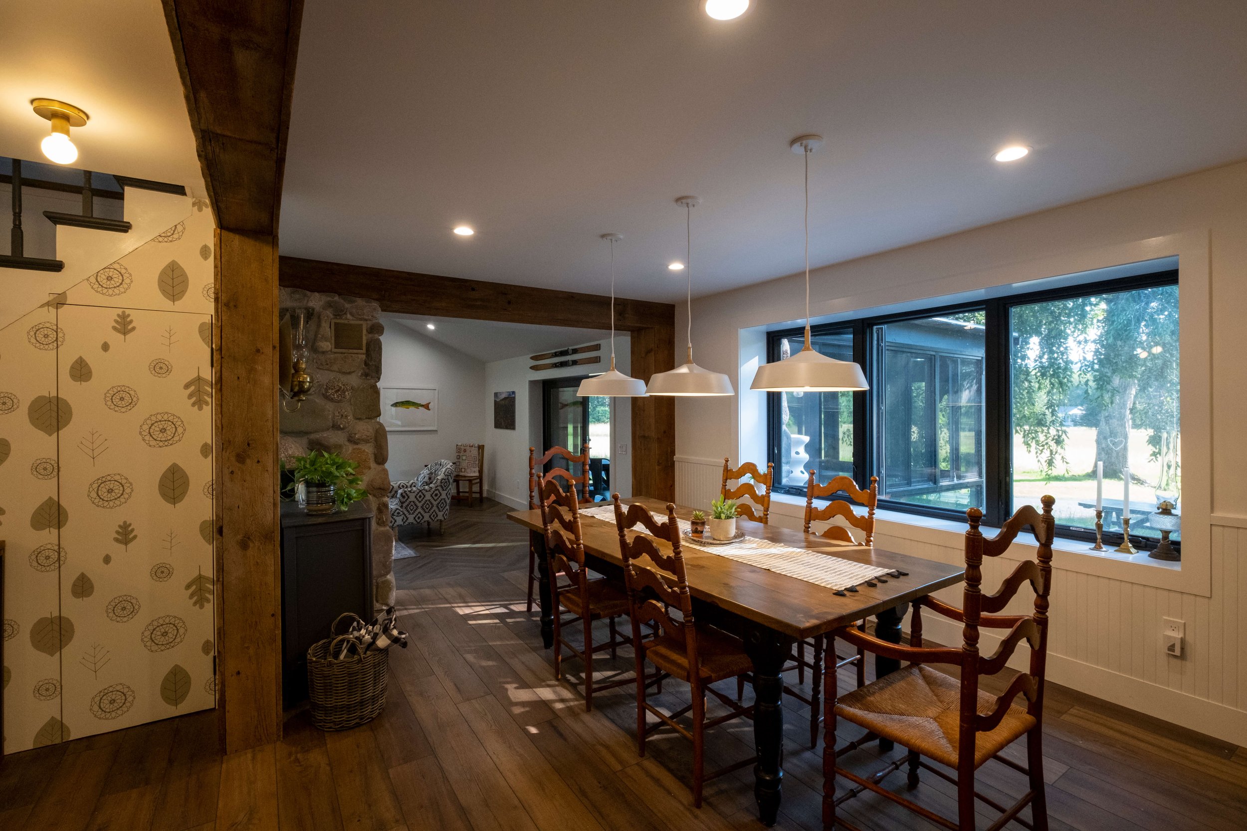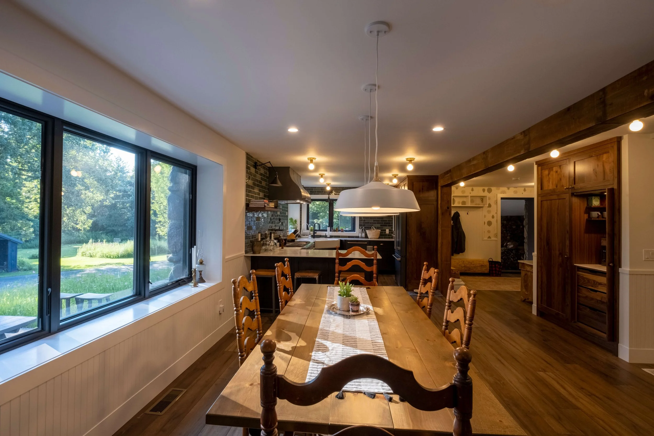 The open concept nature of the dining and kitchen areas mean each are an extension of the other. I found a great vintage farmhouse table and chairs set up at a great vintage shop in Tannersville that worked perfect for the space, and if you haven’t seen my table sizing vlog you can watch that below to help you size your dining table appropriately. I anchored the table with 3 simple Danish style pendants from Kichler, and centered it on the new picture window and double casement from Renewal by Andersen.